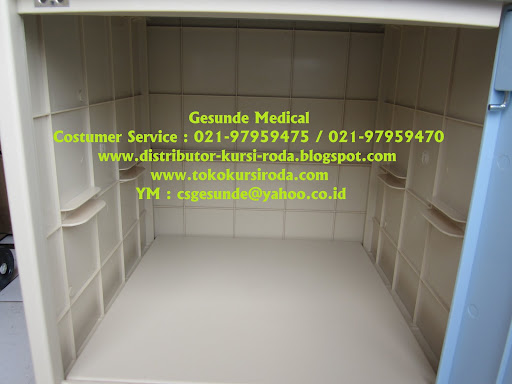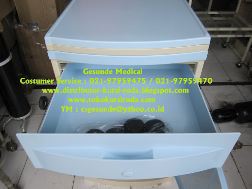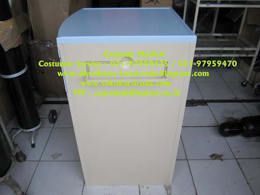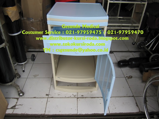 Selain ranjang pasien, untuk perawatan standar rumah sakit juga diperlukan bedside cabinet (lemari pasien) untuk menyimpan keperluan pasien. Lemari pasien ini digunakan untuk menyimpan berbagai perlengkapan pasien, misalnya obat-obatan, handuk, pispot, kapas, tempat minum, dll. Kami jual bedside cabinet dari bahan plastik ABS yang telah dilapisi anti bakteri.